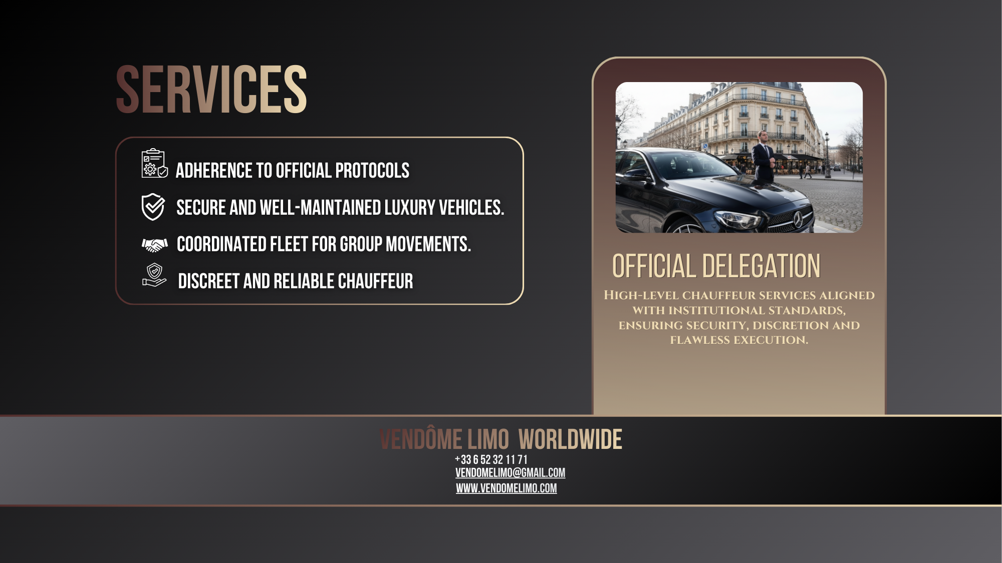 Specialized transportation services for diplomatic missions, official visits and high-level delegations, ensuring security, discretion and protocol compliance.