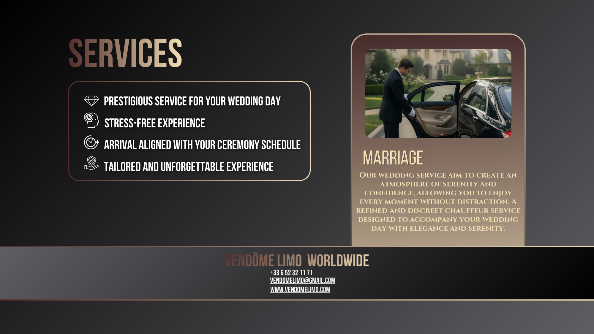 Elegant transportation for your special day.Luxury vehicles and professional chauffeurs to ensure a memorable experience.