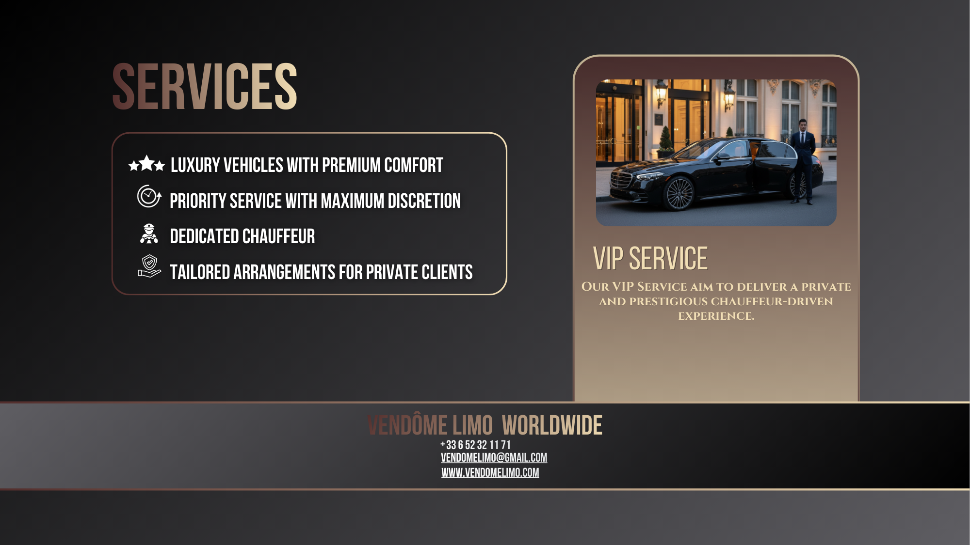 Premium chauffeur service designed for clients who expect the highest standards of discretion, comfort and professionalism. VIP Vehicles available.
